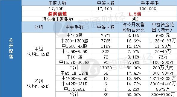其中,公开配售申购人数17105,一手中签率100%,超购倍数1.5倍。