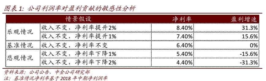 根据我们敏感性分析,基于公司 2018 年上半年 6.4%的净利率水平,公司毛利率每提升 1 个百分点,在收入和费用率保持不变的前提下将推动净利润增长 15.6%。2018 年上半年公司整体毛利率提升 1.7ppt,费用率基本持平,净利润同比增 25.4%;下半年在稳定收入增长和毛利率环比维持预期下,由于 2017 年下半年低基数效应,净利润增速有望超过上半年,全年净利润增速预计可达 32%。同时,我们预计 2019 年公司收入增长将保持 5.9% 的稳健增长,毛利率将在产品结构优化和效率提升努力下继续提升 1ppt,费用率继续下降 0.3ppt,共同推动公司 2019 年净利润持续高增长,增速有望达到 25.5%。