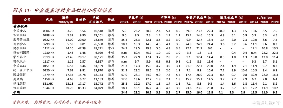 2019 年净利润持续快速增长。根据我们敏感性分析,基于公司 1H18 6.4%的净利率水平,毛利率每提升 1ppt,在收入和费用率不变的前提下将推动净利润增长 15.6%。我们预计明年公司毛利率将提升 1ppt,费用率降 0.3ppt,共同推动明年净利润实现 25.5%的持续高速增长。目前公司 19 年市盈率 18.5 倍,显著偏低于过去 10 年 30 倍估值中枢和港股必选消费公司 19 年平均市盈率 20.5 倍。19 年 EV/EBITDA 仅 6.9 倍,大幅低于全球饮料行业平均 11.2 倍,显示出投资吸引力。