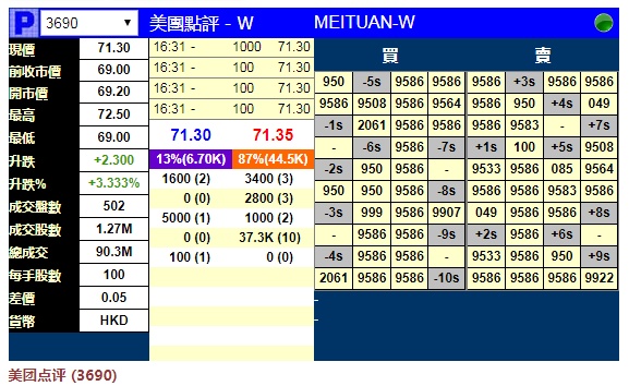 智通财经APP获悉,美团点评(03690)将于下一交易日挂牌,上市前夕,据辉立交易场资料显示,美团点评暗盘开市报69.20元,较招股价69.00元涨0.2元。截至发稿报价为71.3元,较招股价涨3.3%,每手100股。