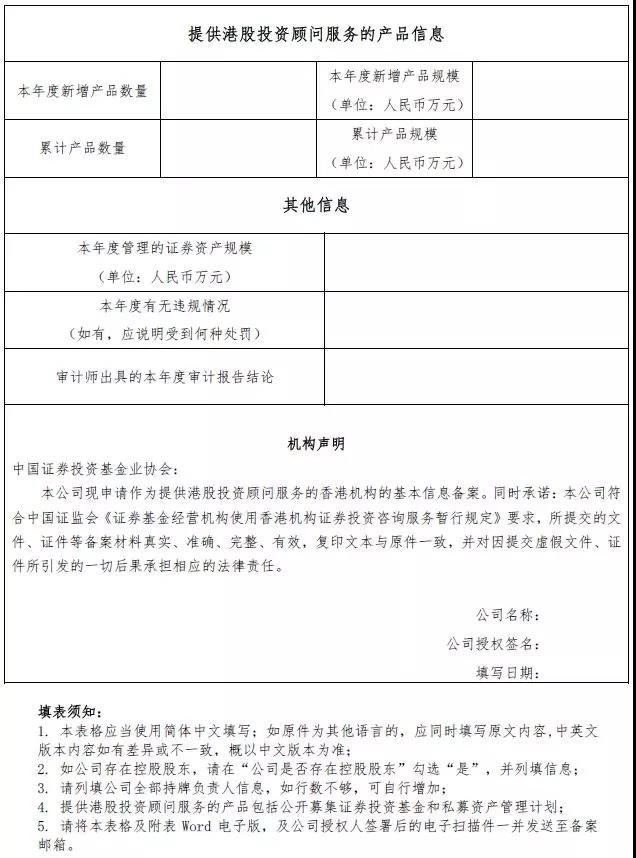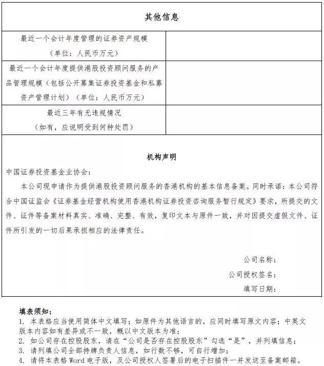 一、提供港股投资顾问服务的香港机构首次备案时,应当提供《香港机构备案材料清单》(附件1)所列文件的电子扫描件,并填写《香港机构基本信息备案表》(附件2),所有备案材料的内容应当真实、准确、完整、有效。