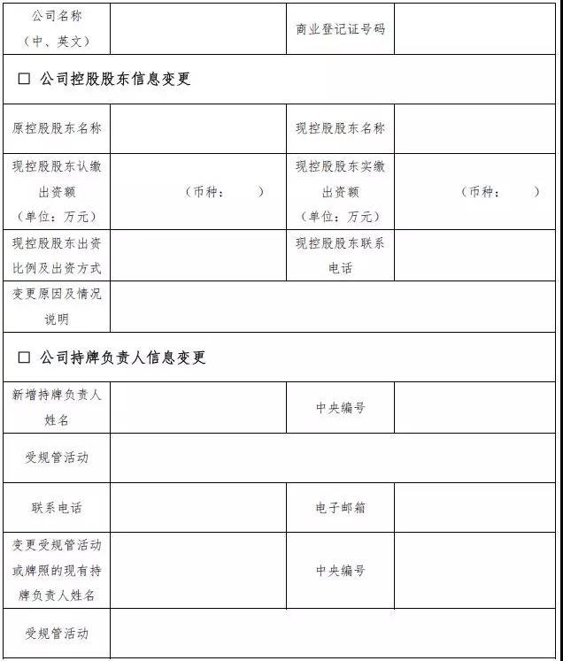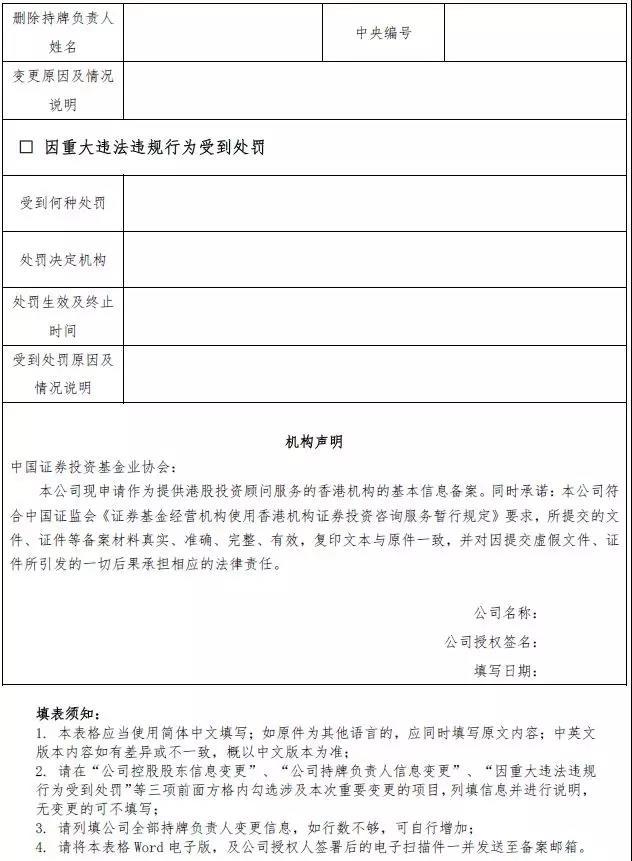三、香港机构在提供港股投资顾问服务期间,如出现控股股东变更、负责人员变更,或因重大违法违规行为受到处罚等重大变化时,应当于7个工作日内完成重要信息变更备案。香港机构应填写《香港机构重要信息变更备案表》(附件3),并将更新后的《香港机构基本信息备案表》(附件2)及相关文件报送至备案邮箱。如联系人发生变更,应及时更新联系方式。