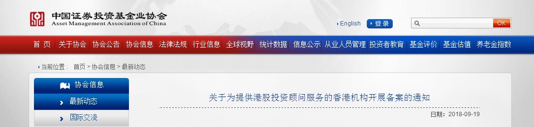 智通财经APP获悉,9月19日,中国证券投资基金业协会发布了《关于为提供港股投资顾问服务的香港机构开展备案的通知》,里面提到,根据中国证监会要求,中国证券投资基金业协会拟于近日为提供港股投资顾问服务的香港机构开展基本信息备案。