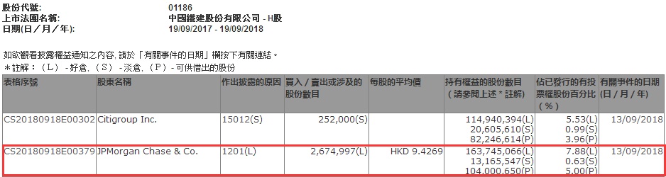 智通财经APP获悉,根据联交所资料显示,摩根大通于9月13日减持中国铁建(01186)267万股,每股作价9.43港元,总值2517万港元,最新持股量约为1.63亿股。