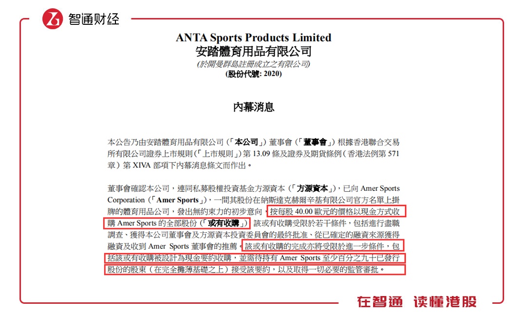 智通财经APP了解到,安踏于9月12日发布公告称,安踏连同私募股权投资基金方源资本,向Amer Sports Corporation (“Amer Sports"),发出无约束力的初步意向,按每股40欧元的价格以现金方式收购Amer Sports的全部股份(“或 有收购”)。