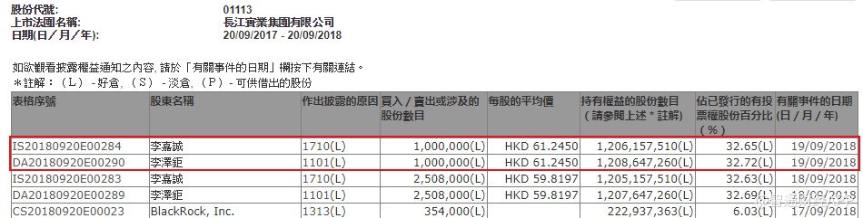 智通财经APP获悉,根据联交所资料显示,李嘉诚及其长子李泽钜于9月19日增持长实集团(01113)200万股,每股作价61.245元,总值1.2亿元,最新持股量分别增至32.65%、32.72%。