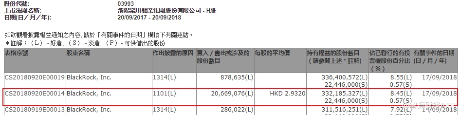 智通财经APP获悉,根据联交所资料显示,贝莱德于9月17日增持洛阳钼业(03993)2067万股,每股作价2.93元,总值6060万元,最新持股量增至8.45%。