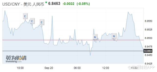 人民币兑美元报6.8463,涨32点子或0.05%。