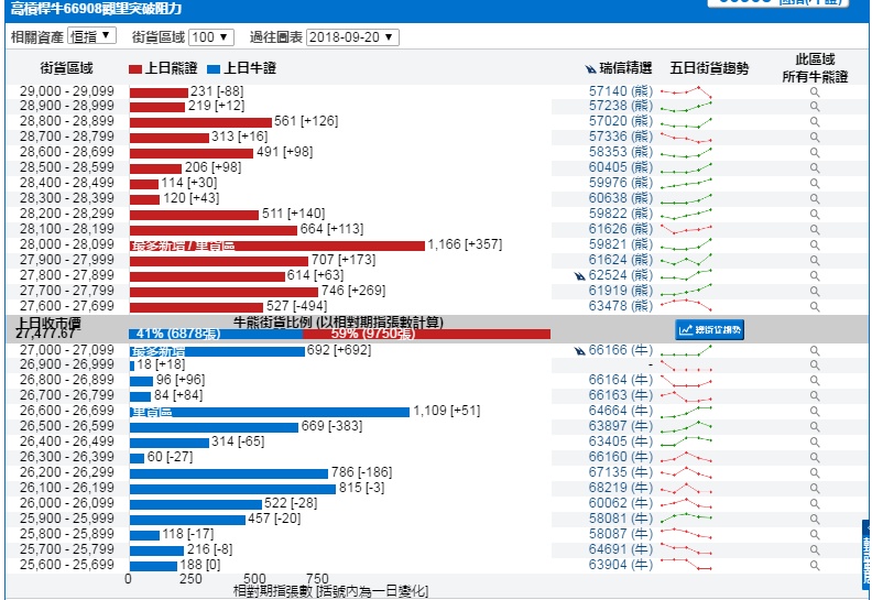 智通财经APP获悉,截至9月20日,恒指最新的牛熊街货比例为41:59。从瑞信恒指牛熊证街货分布图中得到的数据显示,熊证街货重货区在28000-28099区间,该区间熊证数量为1166张,比上一交易日增加357张;最多新增也在这一区间。牛证中重货区在27000-27099区间,该区间最新牛证数量为692张,比上一交易日增加692张。