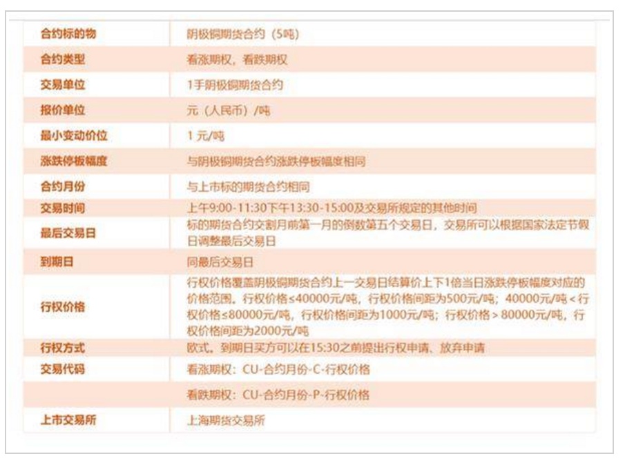 铜期权交易单位为1手(5吨)铜期货合约;合约类型为看涨期权和看跌期权;最小变动价位为1元/吨;涨跌停板幅度与铜期货合约涨跌停板幅度相同;合约月份为1-12月;行权价格覆盖铜期货合约上一交易日结算价上下1倍当日涨跌停板幅度对应的价格范围。以下为铜期权合约细则: