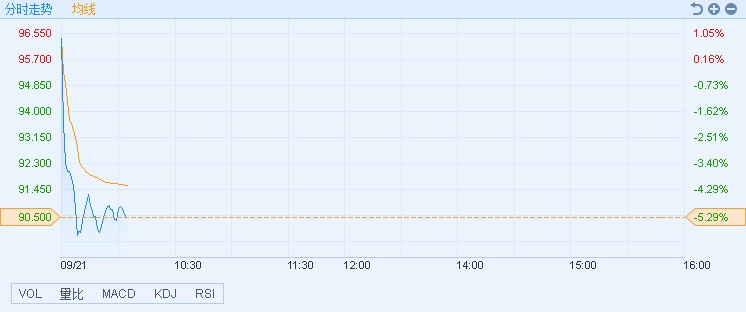 智通财经APP获悉,新iPhone今日现货推出,舜宇光学(02382)今早高开近1%,但遭大摩下调目标价股价随后倒跌,截至10时04分,跌5.23%,报价90.55港元,成交额2.96亿。