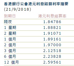 最新数据显示,隔夜港元HIBOR报1.84786%,上升13.2个基点。7天港元HIBOR上升17个基点至1.88821%,为2008年12月以来新高。3个月港元HIBOR报2.12518%,上升3个基点。1年期港元HIBOR报2.59561%,上升1.9个基点。