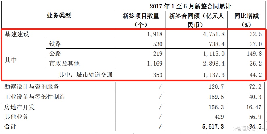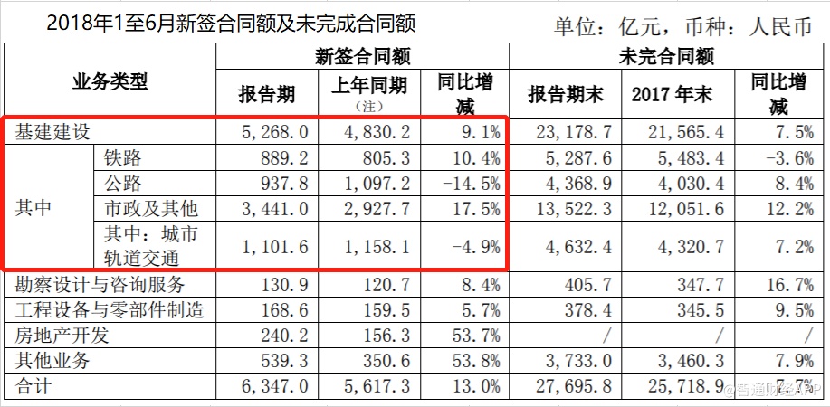 今年上半年,中国中铁基建建设业务新签合同5268亿元,同比增长9.1%,尽管依然维持增长,但增速较2017年上半年的32.5%大幅放缓,其中公路及城市轨道交通新签合同额录得负增长。