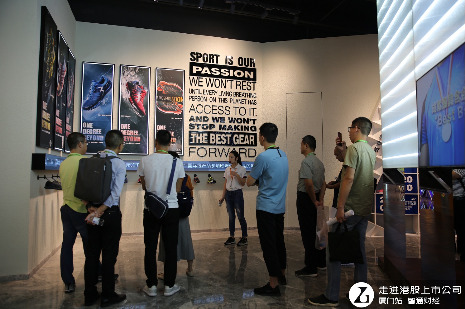 (投资者在361度总部大楼一楼大厅集团品牌馆前合影)