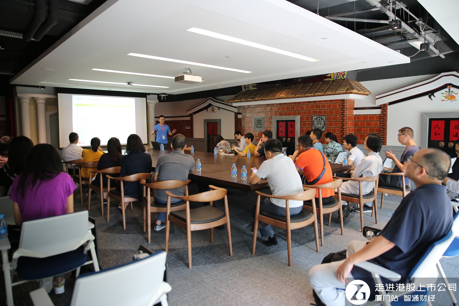 (在富有红墙红瓦特色的会议室中,杨鹭彬正在向投资者介绍公司运营情况)