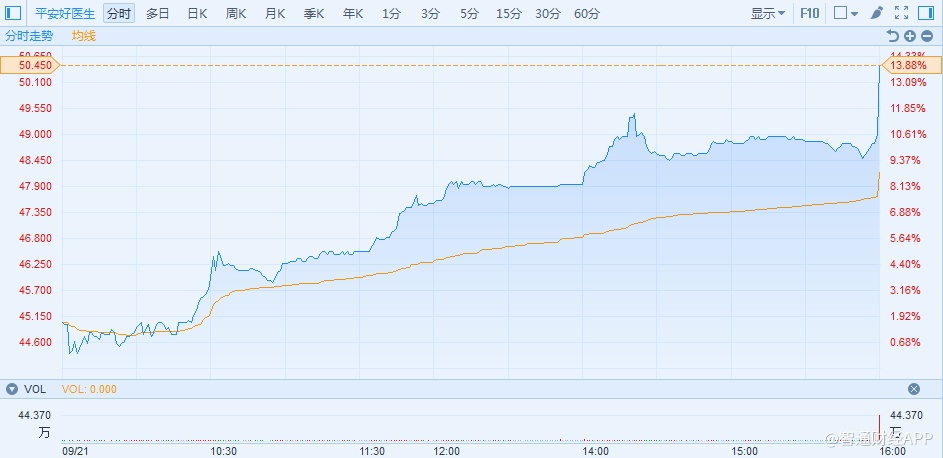 9月21日,平安好医生放量攀升,全天涨13.88%,创上市以来的最大涨幅,收报50.45港元,成交额激增逾1倍至1.14亿港元。