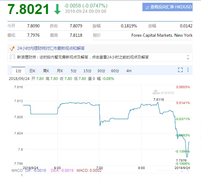 智通财经APP获悉,9月24日早间,港元汇率短线拉升,升近百点至7.7976。后有所下探,截至发稿,报7.8021,升58点子或0.07%。