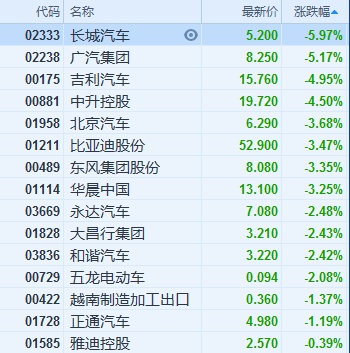 智通财经APP获悉,因促消费重磅文件出台,上周汽车板块集体上涨,现如今集体回吐。截至2018年9月24日10:10,长城汽车(02333)跌5.97%,报价5.20港元。广汽集团(02238)跌5.17%,报价8.25港元。吉利汽车(00175)跌4.95%,报价15.76港元。