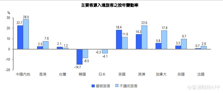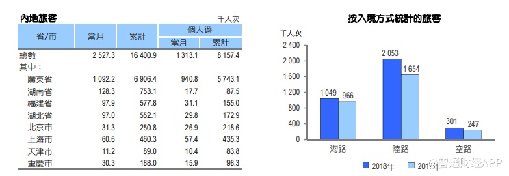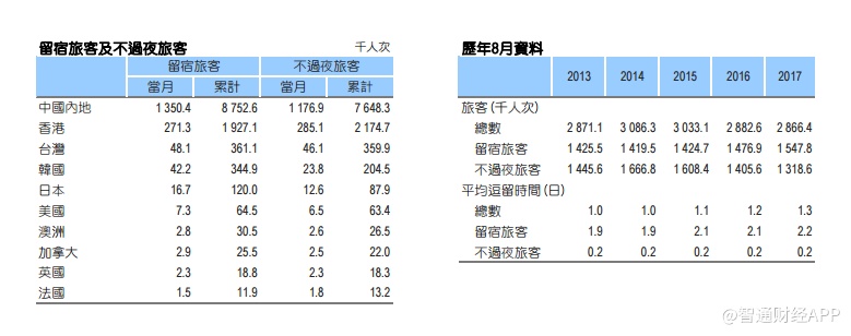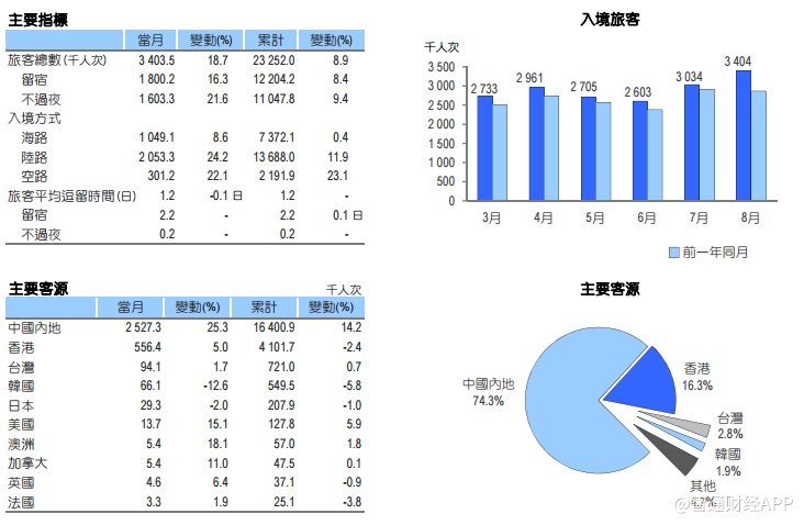 8月中国内地旅客按年上升25.3%,当中个人游旅客增加31.0%。香港及台湾地区旅客有55.64万及9.41万人次,分别上升5%及1.7%,韩国旅客则减少12.6%。。来自美国、澳洲、加拿大及英国旅客均录得升幅。
