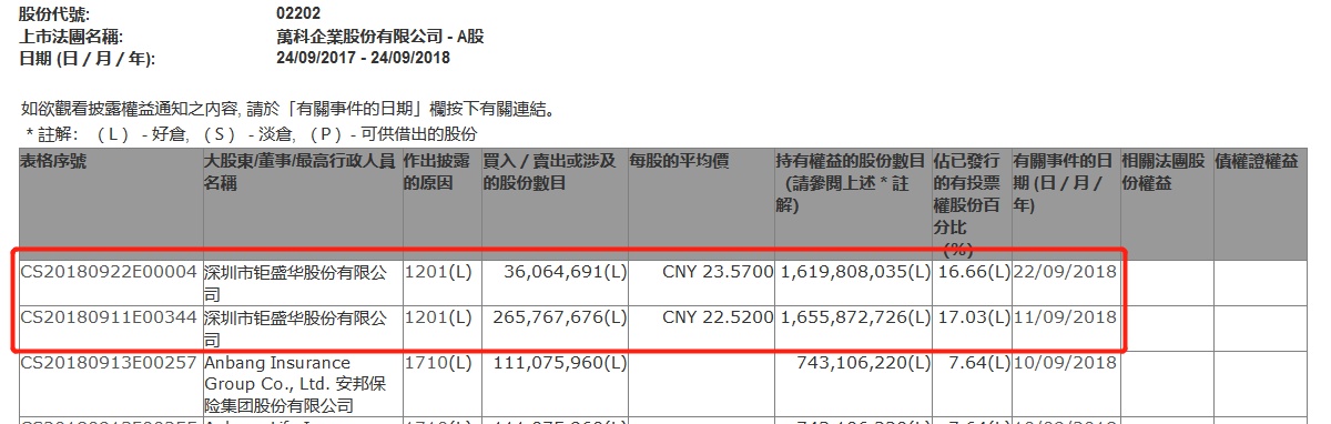 值得注意的是,9月11日,钜盛华亦减持万科A股2.66亿股,每股作价22.52元,套现约59.90亿元。两次加起来总共减持3.02亿股,钜盛华套现68.4亿。