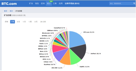比特大陆官网资料亦显示,过去一年内,该公司旗下BTC.com与Antpool,加上其投资的ViaBTC,三家矿池市场占有率合计达到了48.6%。
