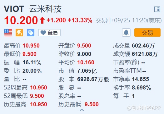 其股价开盘涨5.56%,报9.50美元。截至发稿报10.20美元,大涨13.33%。