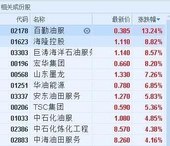 智通财经APP获悉,国际油价创新高,油服板块全线走高,截至11时24分,百勤油服(02178)涨13.24%,报价0.385港元,海隆控股(01623)涨8.82%,报1.11港元,华油能源(01251)涨6.85%,报0.78港元,安东油田服务(03337)涨5.83%,报1.27港元,中石化油服(01033)涨4.85%,报1.08港元,中海油田服务(02883)涨4.16%,报8.26港元。