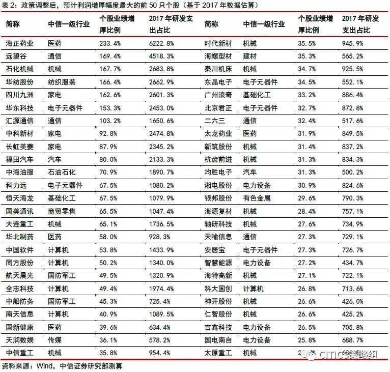 中信证券还进一步梳理出了减税受益最大的50只个股(A股市场),主要集中在机械(13只)、计算机(5只)、电子元器件(5只)等行业: