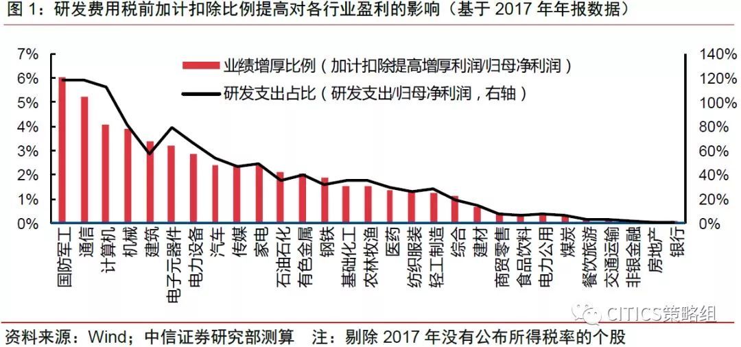 研发费用抵扣新政将利好研发投入较高的行业,其中,国防军工、通信、计算机、机械和建筑五个行业受益幅度最大,对应的盈利增厚比例分别为6.07%、5.26%、4.1%、3.89%和3.35%;