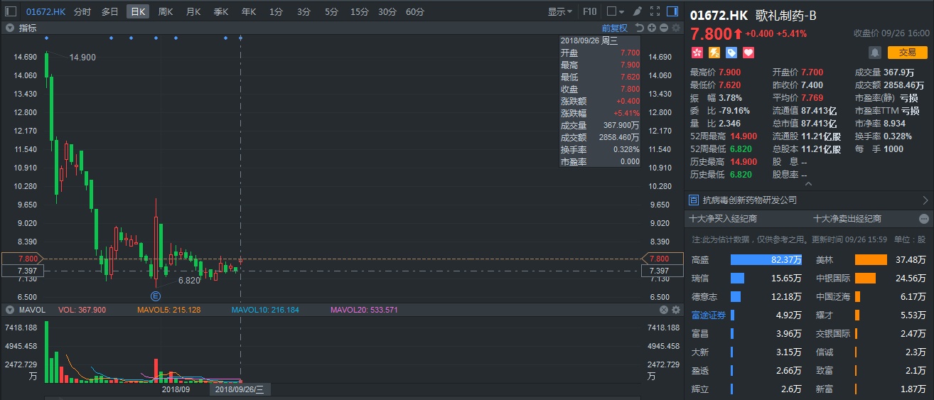 和往常一样,大板块翻红,必定会有几只表现突出的个股,比如上市刚满40个交易日的歌礼制药-B(01672)。该股因抗丙肝药品戈诺卫进入天津市基本医疗保险,实现高开高走,截至收盘,涨幅超过5个点,可成交量却并不高,仅367.9万股,较8月31日的放量大涨相去甚远。
