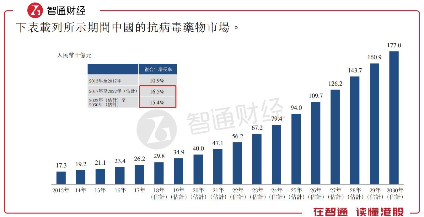 未来十年,预计由于丙型肝炎患者治疗率的上升,中国抗病毒药物市场将稳步增长,2017-2022年的年复合增长率提升至16.5%,2022-2030年稍有下滑,但仍保持15.4%的增速。