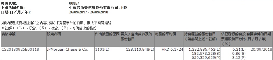 智通财经APP获悉,根据联交所资料显示,摩根大通于9月20日增持中国石油股份(00857)1.28亿股,每股作价6.17元,总值约7.90亿港元,最新持股量升至6.31%。