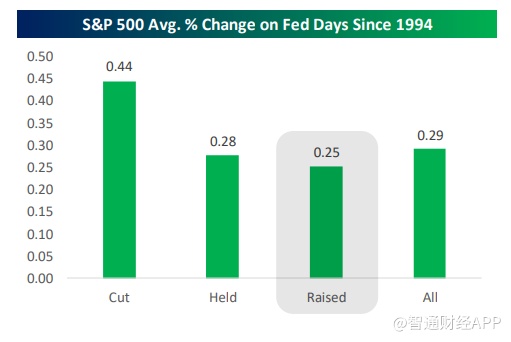 若拉长来看,自1994年以来,标指在美联储公布议息结果当日平均上涨0.28%,而全部交易日平均上涨0.03%。倘若是减息,股市受到鼓舞当日表现更佳,平均上涨0.44%;相比之下,加息时仅平均上涨0.25%。