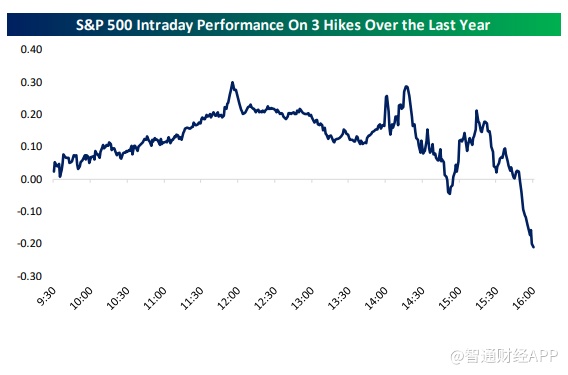 他们的发展似乎也有某种模式。如下面图表所示,标指一开始是上涨的,然后在下午收跌。美联储加息后的第一个月,股市往往会下跌,大盘股基准指数平均下跌0.41%。