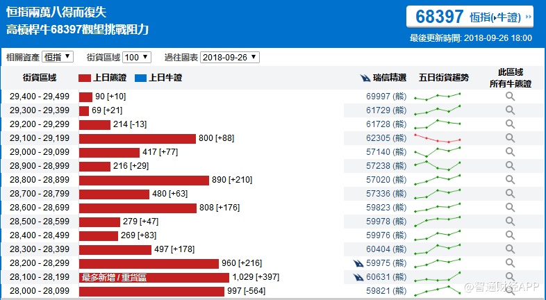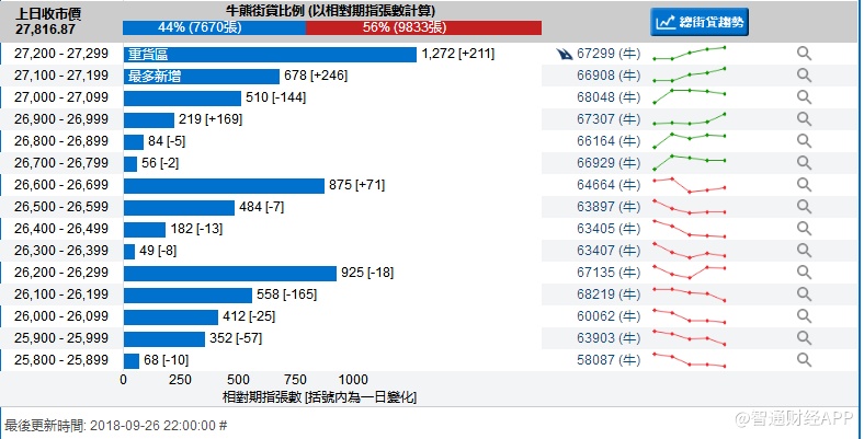 智通财经APP获悉,截至9月26日,恒指最新的牛熊街货比例为44:56。从瑞信恒指牛熊证街货分布图中得到的数据显示,熊证街货重货区在28100-28199区间,该区间熊证数量为1029张,比上一交易日增加397张;最多新增也在这一区间。牛证中重货区在27200-27299区间,该区间最新牛证数量为1272张,比上一交易日增加211张,最多新增在27100-27199这一区间。