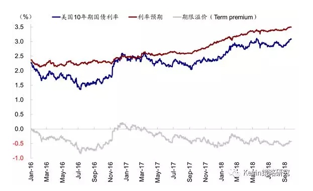 其次,利率“散点图”维持加息路径不变,但上调了中长期利率水平。在此次会议上,15位委员对于未来加息路径预测维持不变,即2018年底2.375%、2019年底3.125%、2020年3.375%,对应2018年加息4次、2019年加息3次和2020年加息1次。不过,此次美联储将中长期利率水平从6月的2.9%小幅上调至3%,这也是在经济持续向好、同时上调GDP预测后的必然结果。实际上,根据纽约联储的数据,当前扣除期限溢价(term premium)后的美债10年期利率真实水平已经升至3.5%左右,远高于美联储的上述预测。