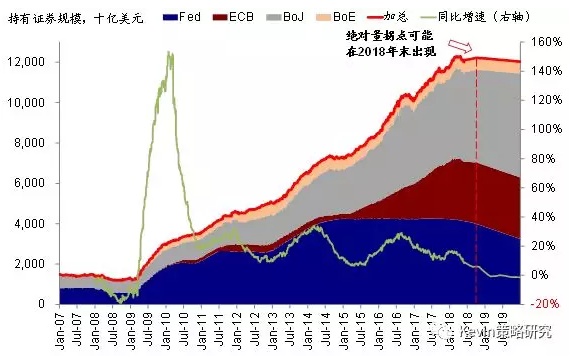 中长期而言,关注全球流动性拐点临近可能带来的影响。相比此次完全符合预期的加息,市场并没有给予过多关注的美联储另一项政策,即2017年10月开启的“缩表”进程今年10月之后也将再度“加码”,每月“缩表”上限将从400亿美元提高至500亿美元(300亿国债、200亿MBS与机构债)。与此相对应的是,欧央行和日本央行购买规模则明显缩减(例如欧央行在9月份刚刚结束的议息会议上已将每月QE购债规模从300亿欧元降低至150亿欧元、并将在今年底结束)。因此,加总来看,按照目前主要央行的变化节奏静态测算,全球主要发达央行通过QE购买所持有的证券资产总量可能在2018年底附近出现绝对水平的拐点。换言之,这意味着全球流动性“水位”自金融危机以来真正意义上的下降。