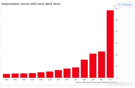 智通财经APP观察到,自4月中旬以来,新兴市场货币兑美元汇率大幅下跌,其中跌幅最大的是土耳其里拉(- 58%)、巴西雷亚尔(- 22%)、南非兰特(-20%)和俄罗斯卢布(-15%)。