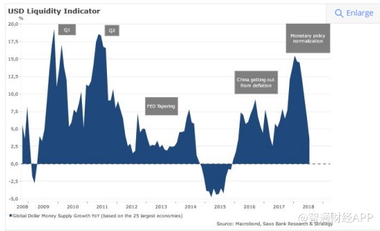 由于货币政策的正常化,自今年年初以来,流动性持续枯竭。盛宝银行基于25个最大经济体统计的全球美元货币供应量模型在2018年1月达到峰值,目前处于2017年春季以来最低水平。