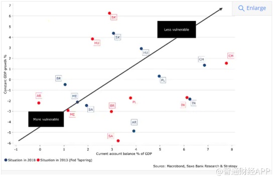 随着全球金融环境收紧,美元流动性紧缩,推动新兴市场融资成本上升。首当其冲的是那些经常账户赤字高(意味着它们严重依赖向外国融资)和以美元计价的债务累累的国家。