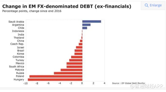 过去几个月,降低了对外汇债务的依赖程度的新兴市场国家,表现出更好的弹性,其中尤为值得关注的是中东欧国家,特别是波兰和匈牙利,这些国家以外汇计价的债务自2016年底以来已经减少了大约9个百分点。