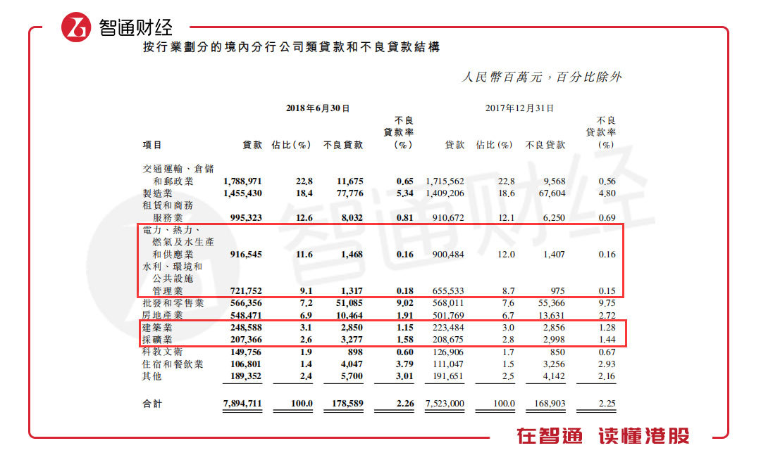 照旧,还是来看一组工商银行(01398)在中报中披露的数据,该行境内分行公司类贷款在2018年上半年达到7.89万亿元,其中,交通运输、仓储和邮政业的贷款金额达到1.79万亿元,占比22.8%与上年同期持平。另外,电力、热力、燃气及水生产和供应业、建筑业、采矿业等基建或与基建相关的行业贷款比重分别为11.6%、3.1%和2.6%,同比下降0.4个百分点、增长0.1个百分点以及下降0.2个百分点。这组数据,在一定程度上反映出从事基建及其相关行业的企业对银行资金需求稳中有减,也进一步反映国家降杠杆政策取得的成效。