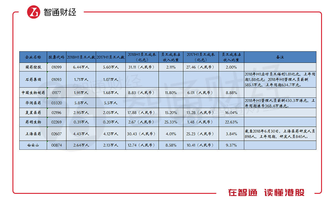 看看这些龙头医药股的员工人数,国药控股(01099)上半年员工人数增长15%至6.44万人;石药集团(01093)增长59.8%至1.71万人;复星医药(02196)增长43.9%至2.95万人……