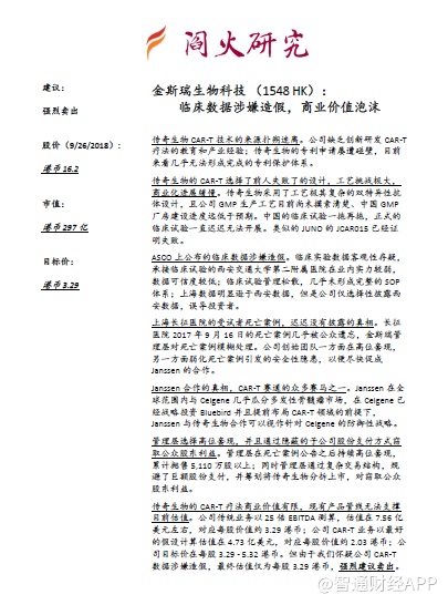 智通财经APP获悉,9月27日,做空机构阎火研究发布报告称,怀疑金斯瑞CAR-T数据涉嫌造假,最终估值仅为每股3.29港币,强烈建议卖出。