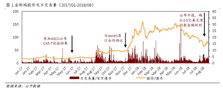 2017年6月,金斯瑞之附属公司传奇生物于美国临床肿瘤学会(ASCO)上公布其以BCMA为靶点CAR-T疗法的临床数据,受到业界普遍关注。数据公布后,金斯瑞股价在短时间内实现了接近10x的增长(图1),公司价值的驱动因素由内源性增长转变为CAR-T技术的事件驱动。