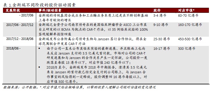 金斯瑞的公司发展大致可以分为4个阶段(表1):1)公布CAR-T数据之前,金斯瑞本质上就是一家中规中矩的CRO公司;2)在2017年ASCO公布CAR-T临床数据之后,CAR-T成为市场焦点;3)与Janssen签订合作协议之后,市场预期进一步加强;4)公司CAR-T业务进展低于市场预期,价格回落。