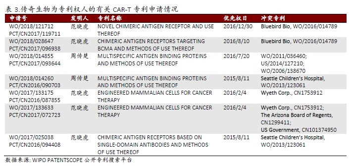 ▪ 传奇生物的CAR-T 相关专利获得授权的可能性为零。审核方认为传奇生物的CART 专利与Bluebird Bio、Seattle Children’s Hospital、Wyeth Corp.等专利权人申请的专利存在冲突(表3)。