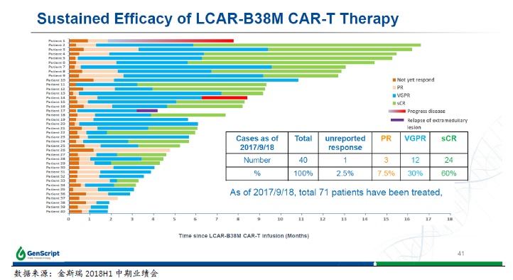 传奇生物自2017年6月ASCO会议上公布其35例临床实验数据之后,仅更新截至2017年9月18日的临床数据(具体原因在第五部分展开分析),没有正式对外公布过其全部71例临床实验的最新数据。