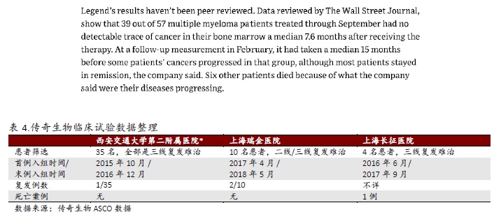 ▪ 根据我们的一线调查,传奇生物的临床试验由整个血液科承接,没有设立专门的实验小组,“哪位医生接的病人就哪位医生做”;
