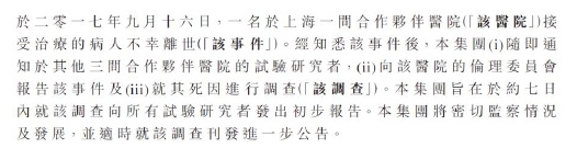 2017年9月19日,金斯瑞发布公告,接受传奇生物CAR-T疗法的一名患者与9月16日离世,公司及时通知其他合作医院,并上报出事医院的伦理委员会,同时对患者死亡原因展开调查。